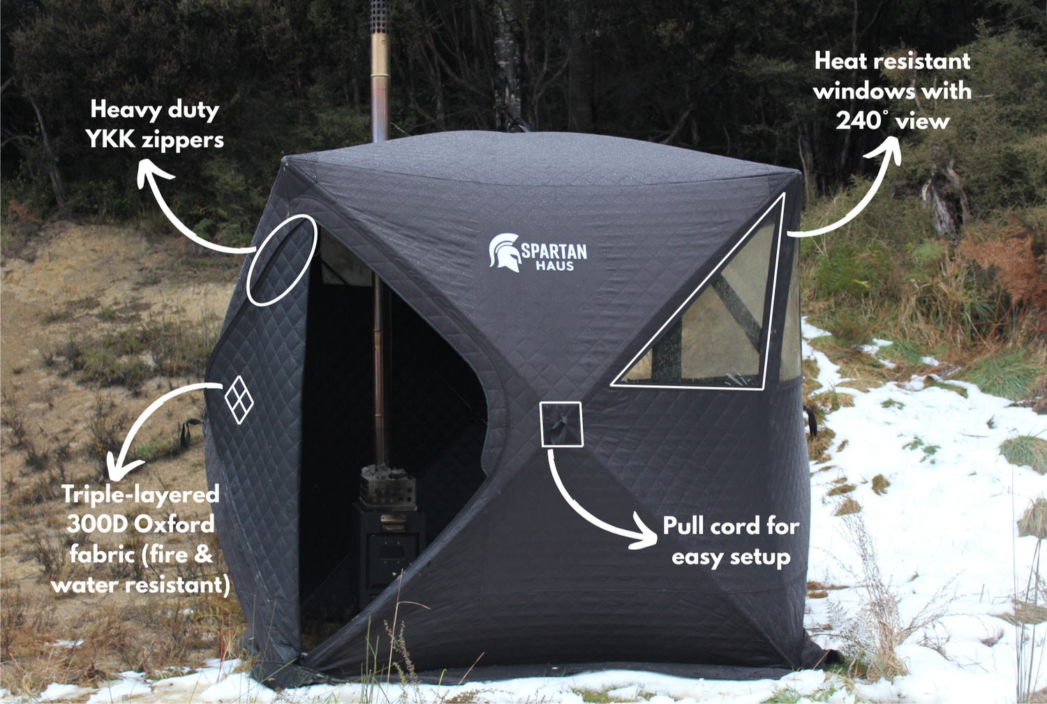 The Spartan Saunas are made from 300D Oxford fabric — a tightly woven, heat-rated, non-off-gassing material commonly used in outdoor gear and medical-grade shelters. The fabric has a high melting point (around 250–260°C), which is far above any temperature a human sauna can safely reach (80–110°C).
